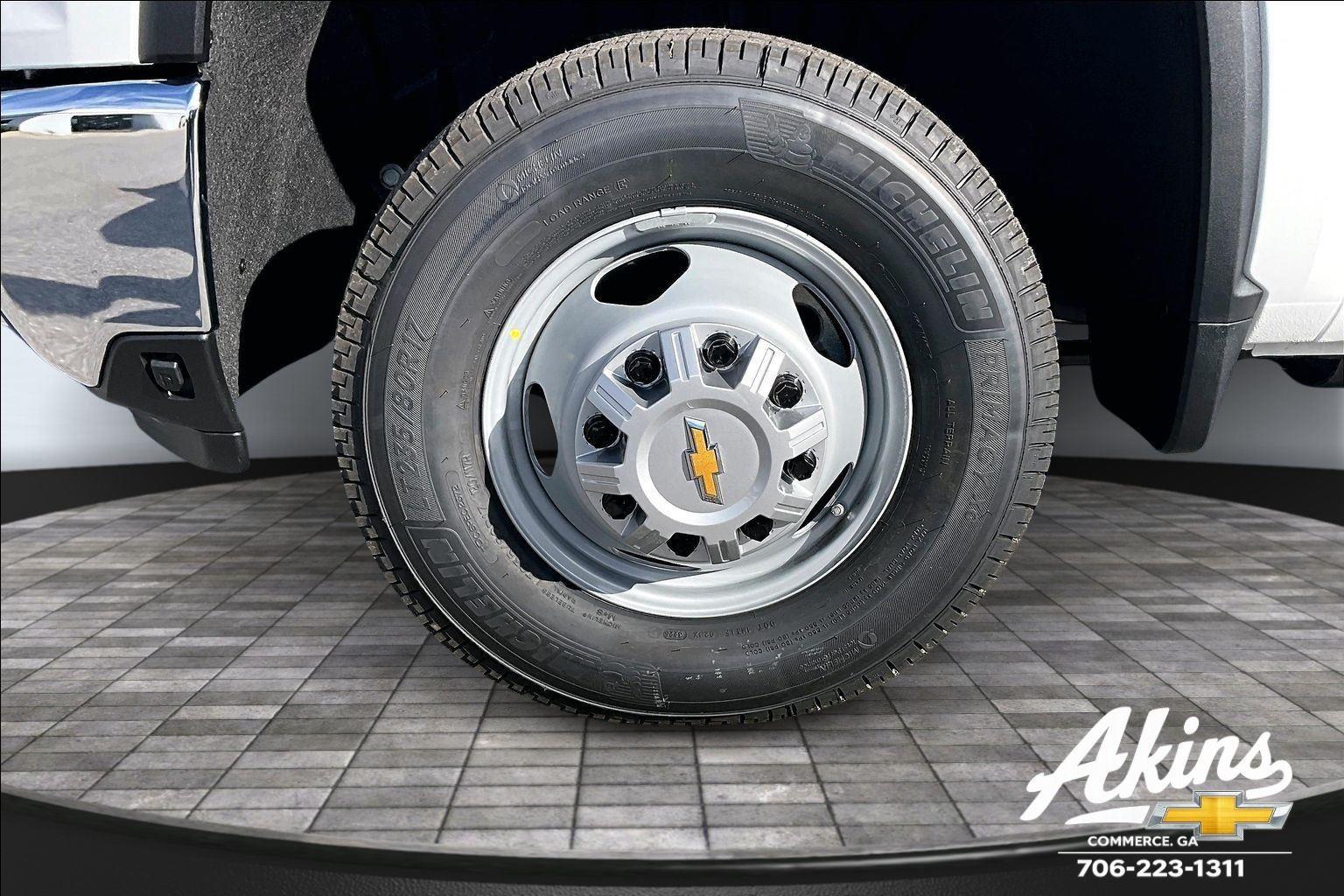 - 17 x 6.5-inch front and dual rear silver steel wheels